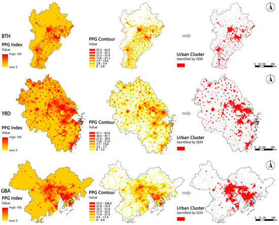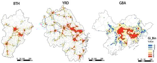 The population density, POI density, and GDP density change significantly near the boundaries of urban clusters. It is feasible and scientific to determine the threshold range of the urban agglomeration boundary by using its density change zone. Therefore, the study identifies the areas with high-density values of the three as urban clusters, where POI density recognition requires nuclear density analysis. It has been shown that smaller bandwidths can reflect local variation but may result in more false peaks. In comparison, larger bandwidths reflect overall variation but may miss or smooth out the spatial structure of urban cluster density []. After comparing the minimum outer rectangle method and the product of the square root method, the “Silverman rule of thumb” was taken to identify the kernel density bandwidth of POI data, which can effectively avoid spatial outliers []. Then, by combining the range and city level of each city cluster, the nuclear density analysis bandwidth interval of BTH, YRD, and GBA was determined; the results were 6.52 km, 8.46 km, and 8.81 km. The geometric margin method was used to categorize and display the generated POI kernel density maps via ArcGIS. The method allows the number of each category and the spacing between categories to be consistent. This is more balanced and eclectic than other methods; hence, the generated map has both the required information to be displayed and maintains a better visualization (Figure 3).