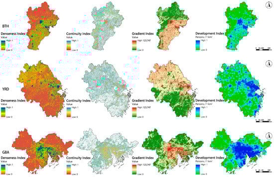 The spatial pattern of denseness, continuity, gradient, and development indexes.