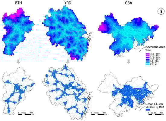 Comparing the urban isochrones with different time intervals, the isolines with a threshold of 20 min better reflect the geographic structure of urban functions in the metropolitan area of a single urban system. The isochronous circle with 20–40 min as the threshold better reflects the boundary, shape, and structure of the multi-city system at the regional scale. The 20 min isochronous circle is regarded as the primary reference basis in the study. The 30 min isochronous circle is used as a secondary reference variable to identify the spatial scope of urban agglomerations by examining the spatial association patterns of urban isochronous circles.