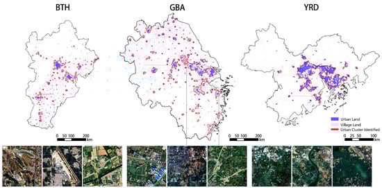 Differences exist in the accuracy of urban cluster area identification for different methods. The average value of the OA of the urban cluster boundaries delineated by the SEM, RSM, and TNM were all between 20.34% and 63.58%. Among them, the identification accuracy of the SEM was relatively high, which was especially clear in the GBA. In terms of the accuracy effect, the maximum improvement of the delineated boundaries of the three urban clusters after data fusion are 56.39%, 61.06%, and 56.58%. The Kappa coefficients of the first three methods are between 0.1830 and 0.5748, with the GBA showing the highest Kappa coefficient overall. The Kappa coefficients after data fusion improved to 0.8115 (BTH), 0.6807 (YRD), and 0.7260 (GBA). With respect to Kappa coefficient enhancement, the fusion of the three data types can more accurately demarcate the boundaries of urban cluster areas. The data fusion method combines the advantages of various types of data and methods to promote the reflection of the structural integrity within urban agglomeration. This can strengthen and polarize the location of the core urban area so that the identified spatial area is more in line with the development status and better reflects the urban clusters’ more detailed neighborhoods, making the delineated boundary complete and accurate. A local Google satellite map comparison is performed for some locations with doubtful validation (Figure 11). These areas are primarily urban–rural fringe and metropolitan fringe areas. The overlapping of artificial and natural landscapes makes them the “leading edge” of urban expansion, as well as the “pioneer area” of rural urbanization. The intersection of the two different nature patches generates dynamic marginal land types, which can easily cause identification errors.