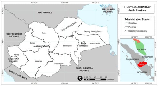 - Statistics of Jambi Province. Jambi Province in Figures 2022; Statistics of Jambi Province: Jambi, Indonesia, 2022. [Google Scholar]