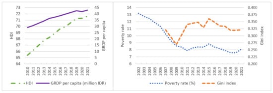 Provincial development indicators will be discussed descriptively, including trends in the poverty rate (2002–2021), Gini index (2007–2021), HDI (2010–2021), GRDP per capita (2010–2021), level of education (2010–2015), sector-based GRDP (2010–2021), and land cover (2011 and 2020). For these data, we selected the initial year of 2010 because in previous years, there were changes in both measurement and categorization that led to inconsistencies in comparisons between years (e.g., [,]). Only the poverty rate can be reliably analyzed by starting closer to the year 2000.