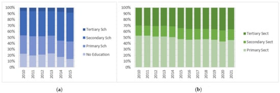 Apart from the growth trend of GRDP per capita and structural shifts in the GRDP, the Jambi Province HDI also improved year to year (Figure 2). In 2010, Jambi’s HDI score was 65.4, and it continued to increase to reach 71.63 in 2021. One of the ways to develop Jambi’s human potential is to seek improvement in educational achievements. Figure 3a shows that the percentage of the population with only primary school education decreased from 2010–2015, as an increasing percentage of residents had obtained secondary and tertiary school diplomas. In a regional context, however, Jambi’s HDI does not appear to be very competitive when compared to other provinces in Sumatra. In 2006, Jambi was ranked 5th []; however, during the following years until 2021, Jambi’s HDI only ranked 7th or 8th.