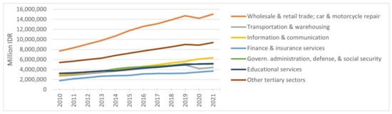 In terms of GRDP per capita, Jambi was securely in third place after the Riau Islands Province and Riau Province in 2010–2022 []. These top two provinces are resource-rich regions, especially in terms of crude oil [] as well as palm oil production [,]. Jambi’s per capita GRDP grew steadily until 2019 (Figure 2). Growth distortions occurred in 2019–2020 due to the COVID-19 pandemic, as the GRDP per capita decreased, then increased again in 2020–2021. In the last decade, there has also been a shift in the GRDP structure. In 2010, the primary sector was still dominant, accounting for more than 50% of the total volume (Figure 3b). This share had shrunk to 46% by 2021. Notably, this decrease in relative share was not complemented by a rise in the secondary-sector contribution, as this sector’s share has remained stable at around 18% for the past decade. Instead, the share of the tertiary sector increased from 30% in 2010 to 36% in 2021. The increase in the contribution of the tertiary sector was largely driven by relatively constant growth in the trade and motorized-vehicle repair sectors (Figure 4).
