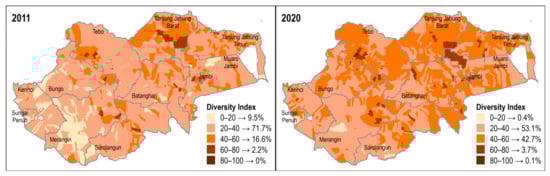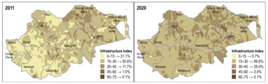 As with economic diversity, the number of infrastructure types is also related to local supply–demand relationships. Therefore, an increase in the amount of infrastructure basically reflects the purchasing power of local residents. An increase in purchasing power will typically be followed by a rise in the volume of certain products or services. Infrastructure has shown an increase in both number and type in most regions []. However, the concentration of infrastructure generally only occurs in a few places which are service center villages []. Usually, but not always, the capital of a kecamatan (sub-district) becomes the service center for other villages in the same sub-district; that is why villages with high index scores were likely to exhibit little change between 2011 and 2020 (Figure 7).