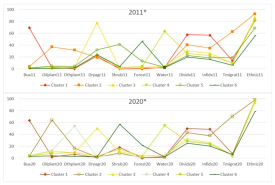 Cluster analysis was carried out to identify the typology of villages that were formed organically in Jambi Province. The analysis was performed for two different years to elucidate how shifts have occurred amid the dynamics of development in the last decade. Silhouette analysis, which was carried out to identify the optimal number of clusters each year, resulted in a value of 6, indicating that we could produce 6 clusters of villages for both 2011 and 2020. Figure 8, Table 2, and Figure 9 show the results of the cluster analysis for each year. In general, all variables involved in the cluster analysis were decisive in differentiating 1 or 2 clusters from others (Figure 8). The variable that proved to be least useful in differentiating the clusters was Ethnic20, which seemed to have more or less the same level among the clusters.