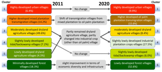 If village typologies in 2011 are compared to those in 2020, some shifts can be identified, as shown in Figure 10. Cluster 1-2020 was for villages with the same characteristics as Cluster 1-2011, namely urban villages. The percentage of villages with this condition increased from 6.4% in 2011 to 9.9% in 2020. Cluster 2-2020 was for transmigration villages. Unlike in 2011, the landscape of the villages of Cluster 2-2020 was dominated by oil palm plantations. The economic diversity index and infrastructure index of these villages were also quite high, ranked second after urban villages.