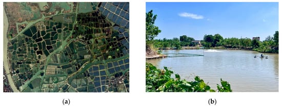 The Mulberry-dyke and Fish-pond System: (a) A remote sensing image of Mulberry-dyke and Fish-pond System in Huzhou (2019). Source: authors; (b) A picture of Mulberry-dyke and Fish-pond System in Huzhou. Source: authors.