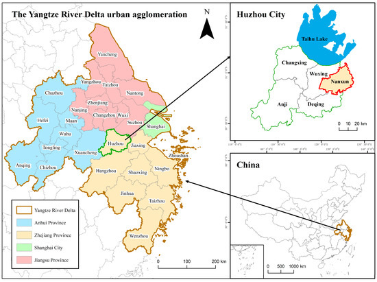 Nanxun District is located in the east of Huzhou City, Zhejiang Province, China (Figure 2), in the north of the Hangjiahu Plain and on the south bank of Taihu Lake. It is a typical water network plain with flat terrain and a dense river network. Located in the subtropical monsoon climate zone, the annual average temperature is 15.5~16 °C, and the average precipitation is 1050~1850 mm [23]. The area of Nanxun District is 702.26 km2. In 2019, the registered population was 490,408, and the rural population was 317,766. The total output value of agriculture, forestry, animal husbandry and fishery for the year was CNY 2707.29 million [24].