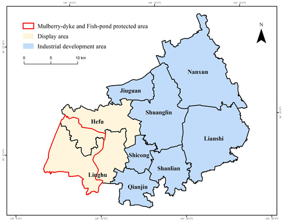- The People’s Government of Nanxun District, Huzhou City, P.R. China. Huzhou Mulberry-Dyke & Fish-Pond System Protection and Development Planning; The People’s Government of Nanxun District: Huzhou, China, 2017.