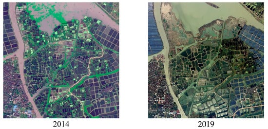 Major changes also occurred in mulberry fields, fish ponds, and paddy fields in each town. From 1975 to 2019, the area of fish ponds in each town increased significantly (Table 7), and the proportion increased significantly. In 2019, the proportion of fish ponds in Hefu Town, Linghu Town, and Qianjin Town was higher than 60%. The area of mulberry fields in each town continued to decrease, and the proportion decreased except for Nanxun Town, and the reduction was most obvious in Hefu Town and Linghu Town. The area of paddy fields in each town decreased significantly, and the proportion also decreased significantly. In 2019, the proportion of paddy fields in Hefu Town and Linghu Town was less than 20%. The scale of fish ponds in Hefu Town and Linghu Town was the largest, and the dyke–pond ratio was between 6:4 and 4:6, which was close to the ratio of traditional mulberry dyke and fish ponds. The structure of fish ponds and mulberry fields is also the most primitive traditional structure of mulberry dyke and fish ponds (Figure 6), that is, the mulberry field is adjacent to the fish pond and embedded in the water network and fish ponds. It shows that this area is the birthplace and gathering area of mulberry dykes and fish ponds in Nanxun District. However, due to the industrialization and large-scale development of fish ponds from 2000 to 2019, the structure of traditional mulberry dykes and fish ponds has been damaged to a certain extent and cannot be completely preserved.