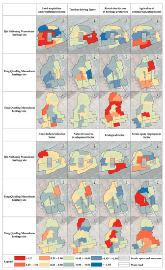 - The land acquisition and resettlement factor. This principal component reflects the impact of land acquisition and resettlement on rural development. In the spatial dimension, the area of requisitioned land is large (0.736), and the per capita cultivated land area is limited (−0.478). The housing conditions of the villagers are at a relatively better level, and most households are two-story buildings (0.547) with a concrete structure (0.842). In the social dimension, the registered residence population (0.833) is larger than the migrant population. In order to obtain more resettlement compensation, household divisions are common, so the number of households is large (0.925), and the per-household population is small (−0.572). On the one hand, the villages with a high score for this principal component are mostly distributed around scenic spots and museums. On the other hand, affected by urbanization, they are mostly distributed on the edges of the heritage sites.
