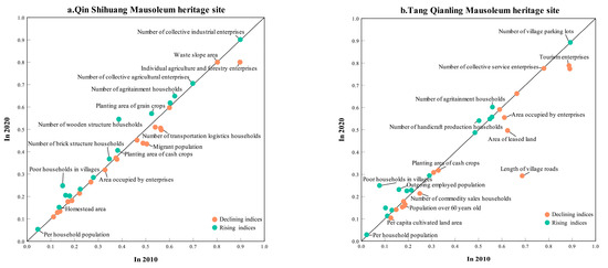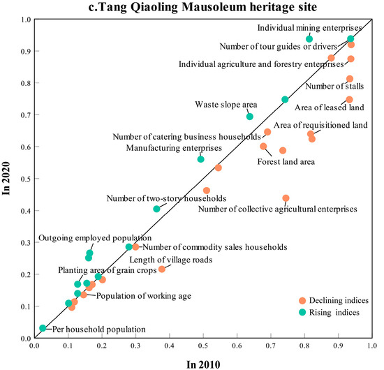 - The social–spatial differentiation indices related to tourism and agricultural industrialization decreased over the past decade. This phenomenon indicates that heritage display and utilization drove the development of the tourism industry in a large region, so the regional balance of tourism development improved. The spatial differentiation indices concerning poor rural households, areas of food crops, etc., increased, which indicates that the gap between the rich and the poor is gradually increasing.