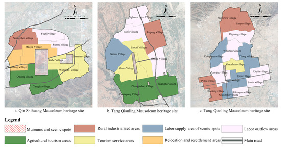 - Through a comprehensive analysis of society and space, it was found that the rural areas of heritage sites have obvious spatial differentiation characteristics and present six major functional areas. Due to the development of the tourism industry and the expansion of scenic spots, the scales of tourism service areas and labor supply areas increased. The cash crop production areas evolved into agricultural tourism areas. This transformation is related to both the development of tourism and the construction of tourist roads. The scale of rural industrialized areas was reduced because of heritage protection policies.