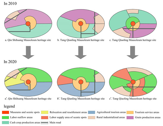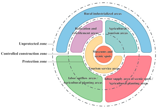 - The TFRA at heritage sites presents the spatial characteristic of a concentric circle because of the circular gradient control of heritage protection zoning. The protection zone, the controlled construction zone, and the environmental coordination zone, which are designated from the inside out, gradually slowed down the control intensity of industrial and agricultural production activities. Thus, the functional structure formed a concentric circle pattern of “service industry–surplus labor supply (agriculture)–rural industry” from the inside to the outside.