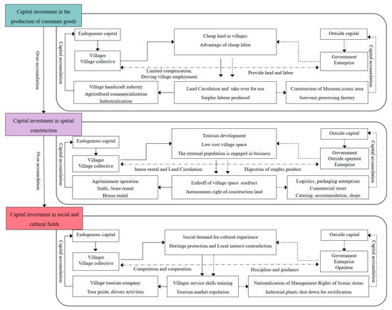 - Capital investment in the production of consumer goods. The productive input of capital into consumer goods, such as agricultural production, industrial production, tourism souvenir production, and heritage protection policies, and the optimal allocation choice of capital led to changes in the production modes of villages and their spatial differentiation. Since then, due to homogeneous competition and the overproduction of consumer goods, capital has begun to be invested in space construction to resolve the crisis of overproduction and to provide convenience for production and consumption.