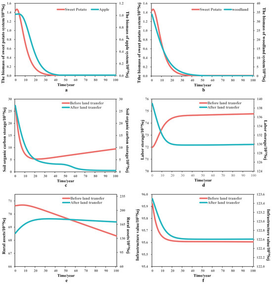 Before land transfer, labor storage gradually increased, reaching a steady state of 74.61 × 1014 sej after about 30 years, with an average annual increase of 0.12%. After land transfer, a large amount of foreign labor is attracted to the area to obtain employment. The initial value of labor storage is much higher than that of the original labor storage before land transfer. Labor storage shows a gradual downward trend, reaching a steady state of 129.98 × 1014 sej after about 20 years, with an average annual decrease of 0.32% (Figure 4d). Before land transfer, rural assets do not fluctuate considerably during the first 10 years, remaining at 70.6 × 1014 sej, and then slowly declining, with an average annual decrease of 0.04%. Rural assets are much higher after land transfer than before. Rural assets show a steady upward trend, reaching a stable state of 170 × 1014 sej after about 30 years (Figure 4e). Before and after land transfer, infrastructure value decreases steadily to a stable state, but infrastructure value is much higher after land transfer than before. The decline rate is higher before than after land transfer. Infrastructure value reaches a stable state of 95.6 × 1014 sej in the 25th year before land transfer and 122.6 × 1014 sej in the 30th year after land transfer (Figure 4f).