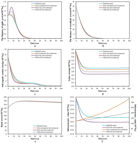 Energy changes of system components based on the perspective of investment behavior. (a) the biomass of apple system, (b) the biomass of woodland system, (c) soil organic carbon storage, (d) labor storage, (e) rural assets, (f) infrastructure value.