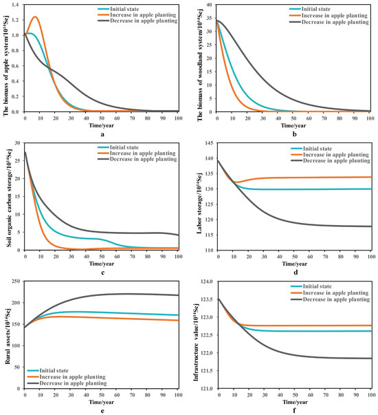 When the apple planting areas are increased, the apple system biomass rapidly increases to the maximum value of 0.91 × 1014 sej in the ninth year, and then decreases to a steady state. When the apple planting areas are reduced, the biomass sharply declines in the first 10 years and then decreases at a slower rate (Figure 6a). With an increase in apple planting areas, the biomass of the woodland system decreases sharply. When the apple planting areas are decreased, the woodland system biomass decreases slowly (Figure 6b). With all three land use types, soil organic carbon storage first decreases rapidly and then slowly reaches a steady state. Under the scenario of reducing apple planting areas and increasing woodland areas, the steady-state value is the highest of 4.8 × 1014 sej (Figure 6c). When the apple planting areas are increased, labor storage rapidly declines, then slowly rises to a steady state of 132 × 1014 sej after 15 years. With reduced apple planting areas, labor storage continues to decline, reaching a steady state of 118.6 × 1014 sej after 60 years (Figure 6d). With all three types of land use, rural assets rise slowly, and increase faster after apple planting areas are reduced. The highest steady state of rural assets is 220 × 1014 sej (Figure 6e). Infrastructure value shows a downward trend, and declines faster after apple planting areas are reduced, reaching a steady state of 121.9 × 1014 sej after 60 years (Figure 6f).