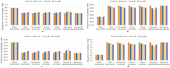 Proportions of four types of ecosystem services. (a) provisioning value, (b) regulating value, (c) supporting value, (d) cultural value.