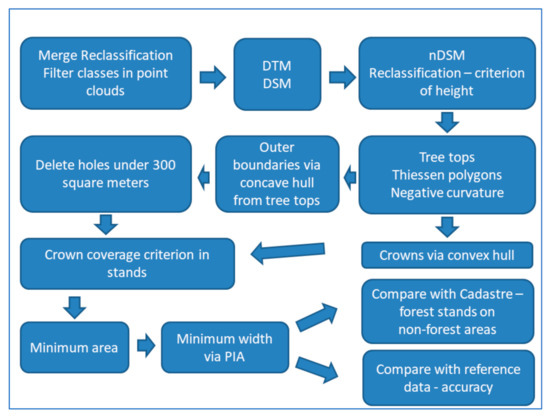 The sequence of processing ALS data from a publicly available source using free software tools to identify the boundaries of forest stands and forest patches can be considered the main result of the experiment. This process is structured and non-trivial, with more specific details. For general orientation, we have presented a diagram in Figure 2.