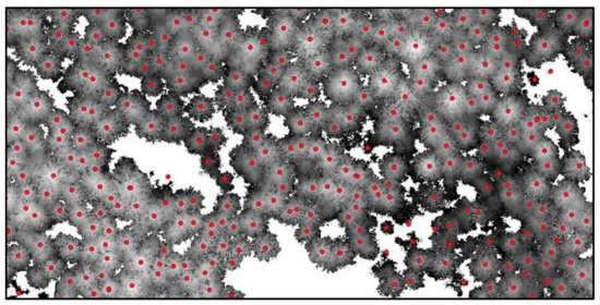 To locate the outer boundaries of continuous areas of forest stands, or edges of forest patches (leading along the outer perimeters of crowns at the edges of stands or forest patches), it was first necessary to identify individual tree crowns. This non-trivial procedure also conditioned the assessment of the degree of density of the tree canopy, or the coverage of the growth area with their crowns. The methodology published by [35] was used to identify tree crowns. Based on this methodology, the first step was finding the treetops. Surface local maximum searches and tree crown identification are implemented in QGIS software, using the Tree Density plug-in via the Tree Density Calculator. The input for this module was nDSM; the output was an information layer of points representing the tops of tree crowns with an assigned height (example see in Figure 4).
