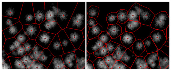 Comparison of (left) Thiessen polygons; and (right) polygons adjusted for negative curvature, both based on nDSM.