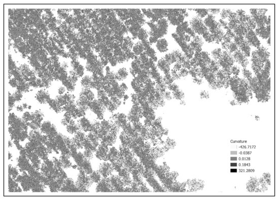 Negative curvature values represent concave shapes, and positive values represent convex shapes. Zero curvature values are inherent to flat surfaces. Concave shapes, i.e., negative curvature values, are typical for tree crown canopies. By selecting (reclassifying) areas with negative curvature values and the subsequent automated vectorization of their perimeter, vector layers were created, delimiting areas of crown canopies. By combining vector geometries delimiting Thiesen polygons and areas with negative curvature values, we obtain the required identification of tree crown perimeters and the gaps between them. We present a visualization of an example of the application of the procedure in the left part of Figure 5.