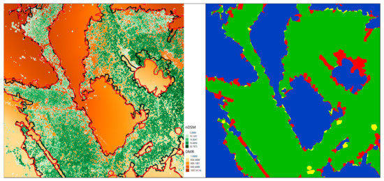 The next step was the rasterization of the cloud of points on a grid with a resolution of 0.25 × 0.25 m. The class ground (terrain surface) was used to create the DTM, and the layers “low vegetation”, “medium vegetation”, and “high vegetation” were used to create the DSM. The CloudCompare software includes a Cloud to 2D Raster Conversion module. The normalized DSM (nDSM) was created by subtracting the DTM values from the DSM values, using the raster calculator in the QGIS software. The values of the created nDSM represented the height of the vegetation canopy (in our case, stands of forest tree species) above the terrain surface. Using the Sort by Table module, we could exclude stands below the selected height value as needed. We could check the fulfillment of the selected minimum height criterion for classifying the patch into the forest category (example see in Figure 3).