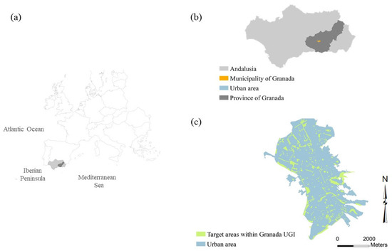Study area location (a) Iberian Peninsula; (b) Municipality of Granada within Andalusia region; (c) Granada urban area and target areas within the urban green infrastructure (UGI).