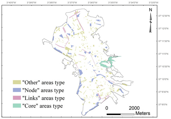 Target areas per type in Granada’s urban green infrastructure (UGI): Percentage of the total UGI area: “Other” areas, 38.59%; “Node” areas, 36.84%; “Link” areas, 10.74%; “Core” areas, 13.83%.