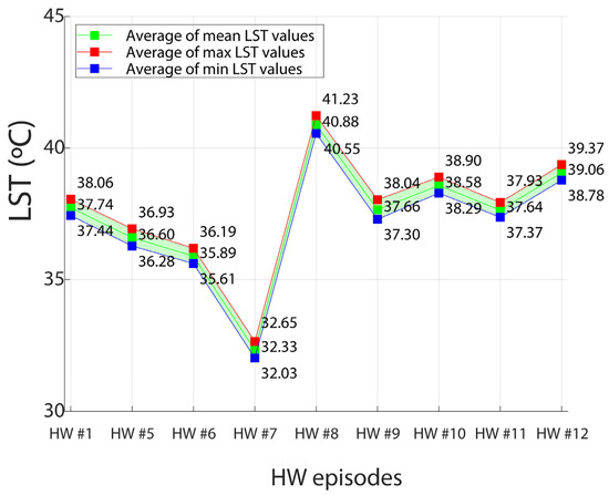 Figure 4 shows LST values calculated over the targeted UGI areas in Granada. Averages of the mean, maximum, and minimum LST values were calculated for all the areas in each heat wave episode. LST estimation referred to HW #7 as the least extreme, with averages from 32.03 °C to 32.65 °C over the target UGI areas. The first warm spell event registered in 2020 (HW #8) was the most impactful one from the whole period under consideration, with temperature averages between 40.55 °C and 41.23 °C. The second half of the period under consideration (years 2020, 2021, and 2022) showed slightly higher LST values than the first episodes for years 2017, 2018, and 2019 (Figure 4).