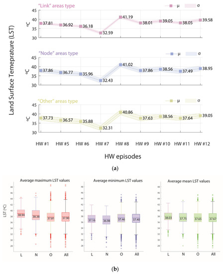 (a). LST mean value per episode and area type. (b). LST mean value per are type in all periods. Whiskers determine the extent of the data inliers. Circles represent outliers.