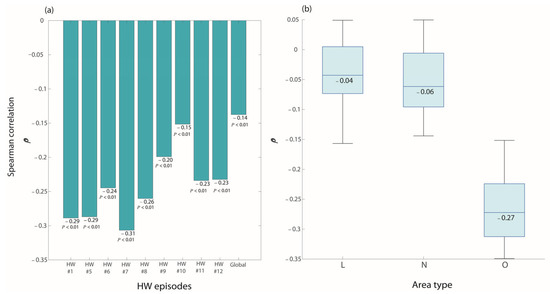 Spearman correlation coefficient between NDVI and LST for all targeted areas per HW episode (a) and per area type for all episodes (b).