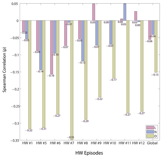 Figure 6 presents the results of the statistical analysis performed on the nine-episode dataset, one per heat wave event with available data. The Spearman correlation coefficient between NDVI and LST estimation is shown as statistically significant for all periods (p < 0.01). Negative correlation coefficients are presented for all periods, with HW #1 (ρ = −0.29), HW #5 (ρ = −0.29), HW #7 (ρ = −0.31) and HW #8 (ρ = −0.26) having the strongest correlations. Compared to those, a moderate negative correlation is observed for episodes HW #6 (ρ = −0.24), HW #9 (ρ = −0.20), HW #11 (ρ = −0.23), and HW #12 (ρ = −0.23), while the weakest correlation appears for event HW #10 (ρ = −0.15). The Spearman correlation analysis between NDVI and LST values per area type for all episodes shows the most negative correlation for the Other area type (ρ = −0.27). From the same assessment, a weaker correlation is observed for Link (ρ = −0.04) and Node (ρ = −0.06) area types (Figure 6).