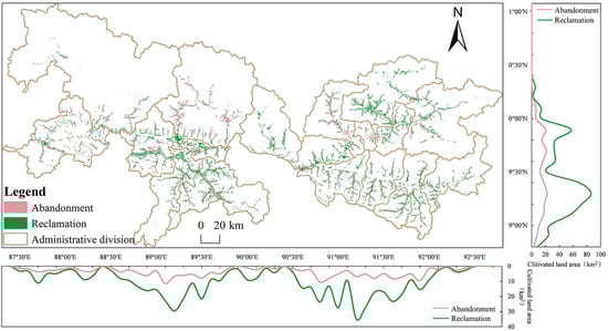 From 2000 to 2020, 558.57 km2 of cultivated land was reclaimed in the YLN region, with a growth rate of 25.47%. The area of abandoned cultivated land was 196.85 km2, and the abandonment rate was 8.29%. Judging from their spatial distribution (Figure 2), reclaimed cultivated land was mainly concentrated in the eastern and southern regions, particularly in the northeast and southwest, whereas abandoned cultivated land was scattered, with a relative distribution in the central and northern parts. A fishing net was built in ArcGIS10.8, and the distribution of cultivated land at different latitudes and longitudes was determined to reveal the distribution law, as shown in Figure 2. The amount of reclaimed cultivated land fluctuates significantly with changes in latitude and longitude. It exhibits a wave-like trend of increasing and then decreasing, with increasing longitude and repeating of the same cycle. The peaks appear at 89°12′ E and 91°12′ E, respectively. With the increase of latitude, there is also a “double peak” phenomenon, with peaks appearing at 29°18′ N and 29°54′ N, respectively. Compared to reclaimed cultivated land, the number of abandoned cultivated lands changed relatively smoothly with latitude and longitude, and the range of change was relatively small.