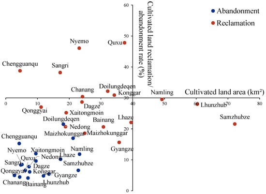 A quadrant map of cultivated land distribution was drawn based on the land data of cultivated land of 18 districts and counties in the YLN region (Figure 3). The total area of reclaimed and abandoned cultivated land in each district and county in the YLN region showed significant regional differences. The distribution of reclaimed cultivated land in each district and county in the YLN region was relatively scattered from 2000 to 2020, showing no apparent regularity. Among them, the Samzhubze District had the most cultivated land, with a total increase of 72.16 km2. Qonggyai County had the lowest at only 11.15 km2. Quxu County showed the highest rate of reclamation and abandonment of cultivated land in the studied 20 years at 47.80%, whereas Gyangze County showed the lowest rate at 15.61%. The distribution of abandoned cultivated land in each district and county is relatively concentrated in the third quadrant, which shows that the abandonment rate of cultivated land increased with an increase in land area under cultivation. Namling County had the most abandoned cultivated land, with a total of 23.26 km2. Doilungdeqen District has the highest rate of abandoned cultivated land, accounting for 21.50% of the total.