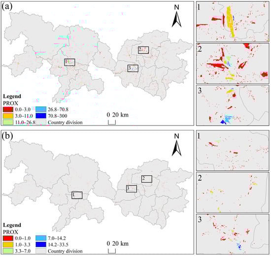 PROX distribution map of (a) reclaimed and (b) abandoned cultivated lands.