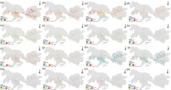 The distribution of cultivated land with the influencing factors, i.e., (a) reclamation under different temperatures, (b) abandonment under different temperatures, (c) reclamation under different precipitation, (d) abandonment under different precipitation, (e) reclamation with different elevations, (f) abandonment with different elevations, (g) reclamation with different slopes, (h) abandonment with different slopes, (i) reclamation with different aspects, (j) abandonment with different aspects, (k) reclamation with different SOM, (l) abandonment with different SOM, (m) reclamation with different traffic conditions, (n) abandonment with different traffic conditions, (o) reclamation with different farming radii, and (p) abandonment with different farming radii.