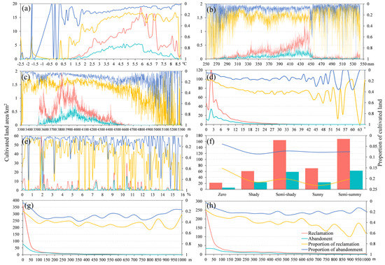 Conditions enabling growth differed for cultivated lands with different aspects due to the differences in available water, heat, and light in different orientations. This aspect affects the spatial pattern of cultivated land to a certain extent. In this study, the slope aspect was extracted based on the DEM, and the distribution of cultivated land in different slope aspects was obtained (Figure 5i,j). The south aspect is sunny; the north is shady; the west, southwest, and northwest are semi-sunny; and the east, northeast, and southeast are semi-shady. Reclaimed and abandoned cultivated land are distributed mainly in semi-shady and semi-sunny aspects. The statistical analysis of the land area under cultivation in different slope aspects is shown in Figure 6e. Distinct degrees of cultivated land distribution were observed in each slope aspect. Cultivated land reclamation and abandonment activities were mostly semi-sunny. However, reclaimed cultivated land shows a relatively higher distribution on sunny compared to on shady slope aspects, and abandoned cultivated land shows a relatively higher distribution on shady slope aspects; therefore, the slope aspect has little impact on cultivated land reclamation and abandonment.