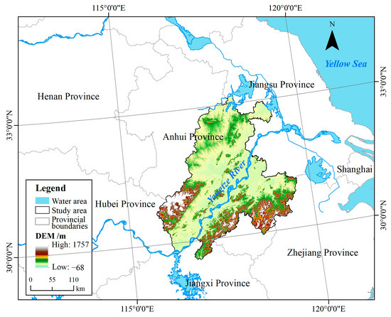 The basin along the Yangtze River in Anhui Province (BAYRAP) is located at 116°35′ E~119°21′ E and 29°31′ N~33°06′ N (Figure 1). It is the main distribution area of the north-south tributaries of the Anhui section of the Yangtze River. The basin covers 57 counties in eight cities, including Anqing City, Chizhou City, Tongling City, Wuhu City, Maanshan City, Xuancheng City, Chuzhou City, and Hefei City in Anhui Province, with a total basin area of over 100,000 km2. The BAYRAP is not only an important component of the Yangtze River Delta Economic Belt but also the core area for the construction of ecological protective screens in the middle and lower reaches of the Yangtze River. The basin has a unique historical and cultural landscape and natural geographical environment and is rich in natural resources, including many resources such as waterpower, minerals, forests, wetlands, biology, and tourism. This basin has an International Important Wetland of Shengjin Lake and more than ten various other national and provincial nature reserves. Lakes and wetlands dotted along the Yangtze River. They are important wintering and breeding grounds for dozens of key endangered wild animals such as white-headed cranes (Grus monacha) and Chinese alligators (Alligator sinensis) in China [25,26]. Therefore, the BAYRAP has become the region with the richest biodiversity in the Yangtze River Delta region and has been also the main position for ecological civilization and biodiversity conservation in the Yangtze River Delta Economic belt. In recent years, with the rapid development of population and urban scale in the BAYRAP, the contradiction between economic and social development and biodiversity conservation in the region has gradually become prominent [27,28]. Therefore, timely assessment of basin habitat quality has been of great significance for basin ecological environment conservation and biodiversity improvement.