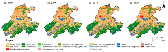 This study involved the land use data of BAYRAP in 1990, 2000, 2010, and 2020, which were from the Resource and Environmental Science and Data Center of the Chinese Academy of Sciences (https://www.resdc.cn, accessed on 8 December 2020). The spatial resolution of the data was 30 m. According to the system of “Classification of Land Use Status” (GB/T21010-2017), the land use data was divided into 17 secondary categories, and the data coordinate system was uniformly converted to WGS_84_Albert.