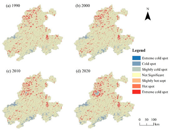 To more comprehensively display the spatiotemporal differentiation characteristics of habitat quality degradation in the basin, this study used the hotspot analysis module of ArcGIS software to reveal the spatial aggregation characteristics of habitat quality degradation from 1990 to 2020 (Figure 6). Before the hot and cold spot analysis, global autocorrelation (Moran’s I) tests were used to calculate the parameter values of habitat degradation in four periods. The results showed that the Moran’s I of habitat quality degradation in 1990, 2000, 2010, and 2020 were 0.73, 0.82, 0.79, and 0.85, respectively, with p values less than 0.01, Z scores of 69, 92, 87, and 93, all greater than 2.58, which indicated that the spatial distribution of habitat degradation had a uniform and significant spatial correlation, and the hot and cold spot analysis had statistical significance.
