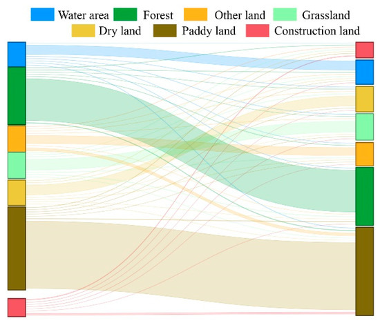 Both single-factor and interactive factor detection results showed that land use type was the most important factor in the evolution of habitat quality in the study area. Therefore, to more intuitively display the influence of land use on the habitat quality in the BAYRAP, this study conducted a visual display of land use conversion in the study area from 1990 to 2020 (Figure 8). The results showed that in the past 30 years, the retention rate of forest and paddy land was the highest among the land use types in the study area. As ecological land, forests promoted the maintenance and improvement of habitat quality in some areas of the study area, while paddy land, as an artificial wetland, had a weak negative influence on habitat quality. As the main threat source in the study area, construction land was mainly transferred from paddy land, and rapid urban expansion has led to the requisition of agricultural land around the city for roads, industrial parks, and urban housing. The increase in urban construction land and the decline in the number of grasslands and woodlands have led to a decline in the quality of the habitat in the BAYRAP.