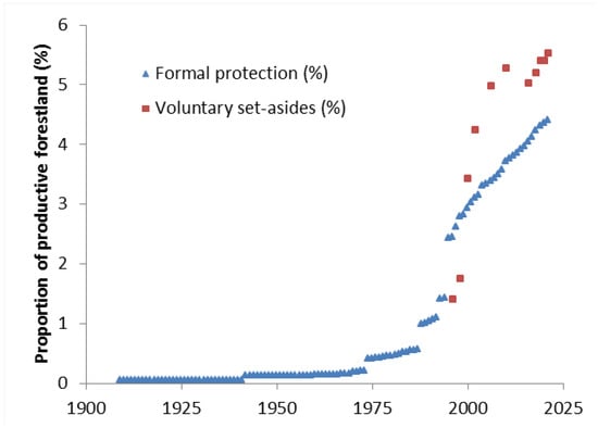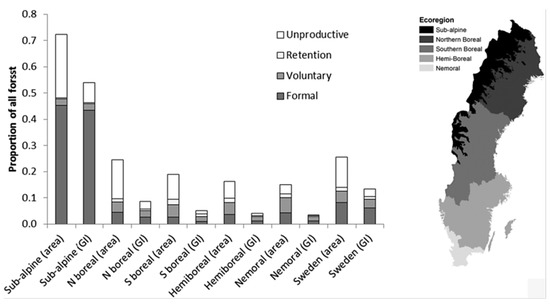 | (i.i) Formal; According to the Environmental Code | (i.ii) Formal; According to the Land Code | (ii) Voluntary Set-Asides | (iii) Nature Considerations (§ 30, Forestry Law) | (iv) Unproductive (Wood Production <1 m3ha−1yr−1) (§ 13a, Forestry Law) | ||
