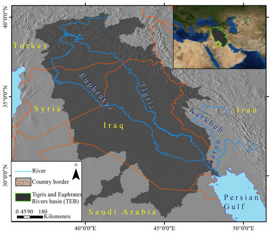The TEB (Figure 1), in the Middle East, is one of the largest river basins with a long-term annual rainfall of less than 166 mm. The TEB expands between 36°41′ to 52°8′ E and 27°13′ to 40°23′ N. The TEB is a transnational and international region with an area of 879,000 square kilometers. Climate projections have predicted declining rainfall, declining river flow, and rising temperatures in this region [19].