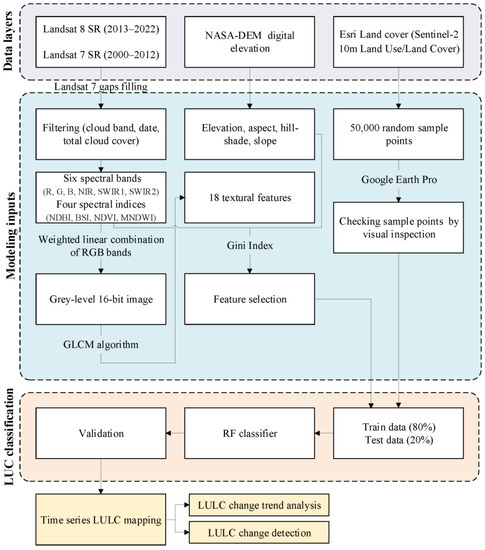 Land is a vital natural resource for human life. Land use/land cover (LULC) is a cross-cutting environmental variable with significant applications in hydrological modeling, watershed management, natural disaster management, climate change studies, and land management [1]. Economic and industrial development, along with rapid and uncontrolled population growth, especially in developing countries in the late twentieth and early twenty-first centuries, have multiplied LULC change [2]. Human-induced LULC change led to adverse impacts on the land’s anthropogenic and natural features at different spatiotemporal scales [3]. It made LULC change monitoring a critical requirement. Quantitative assessment of changes in LULC using time series satellite imagery is one of the most effective tools for understanding and managing land transformation [2].