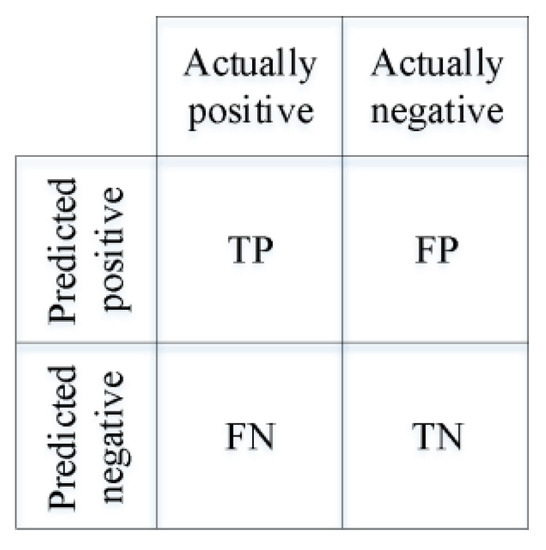 The confusion matrix is a well-known performance measurement for ML-based RS classification algorithms. As Figure 3 shows, the true positive (TP) and true negative (TN) are the numbers of positive and negative samples correctly predicted by the classifier, respectively. False positive (FP) and false negative (FN) are the numbers of negative and positive samples incorrectly predicted by the classifier, respectively. Accordingly, the accuracy and f-score of the results were calculated by Equations (1) and (2), respectively [29].