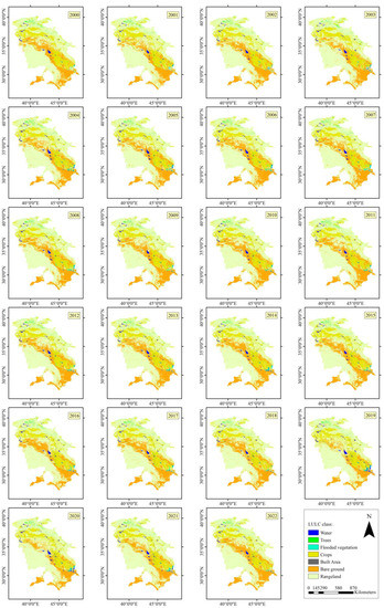 The river basins play a crucial role in the environment and society, providing fresh water, regulating water flow and quality, protecting from natural hazards, and enabling biodiversity conservation. Accordingly, assessing the state of environmental management and natural resources using LULC maps is essential for any river basin or watershed [1]. The Tigris and Euphrates Rivers basin (TEB) is a large river basin in west Asia suffering from climate change and human activities [17,18]. Although the TEB situation affects people’s lives in several countries, to our knowledge, few papers have addressed this region’s multi-temporal LULC change analysis. In this regard, the primary purpose of this study was to create a multi-temporal LULC change analysis in the TEB. First, the RF classifier was adopted and evaluated for LULC mapping from 2000 to 2022. Then, created maps were analyzed to determine LULC changes.