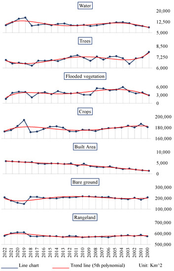 - The Modified Mann–Kendall (MMK) test was applied to determine the LULC classes change uniform trend, and a fifth polynomial was fitted to the LULC classes’ data series to plot the LULC change trend.